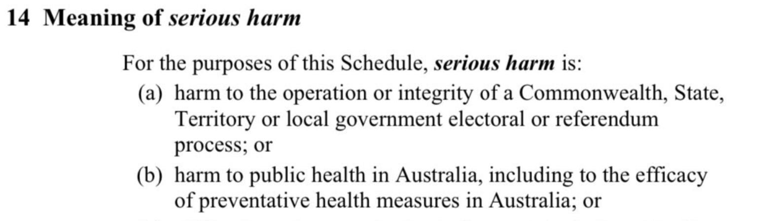 Content only has to be “reasonably verifiable as false, misleading, or deceptive”, but who is doing the verification? Anyone who followed the Covid debacle knows that what is “false” today in a few months becomes plausible, and a few months after that it becomes true - whether that was the theory that the virus may have originated in a lab, the collateral of lockdowns, or that the vaccines would stop transmission. In the future questioning government authorities on these issues will be against the law. In fact, it is stated so explicitly. Harm is to question “the efficacy of preventative health measures”.