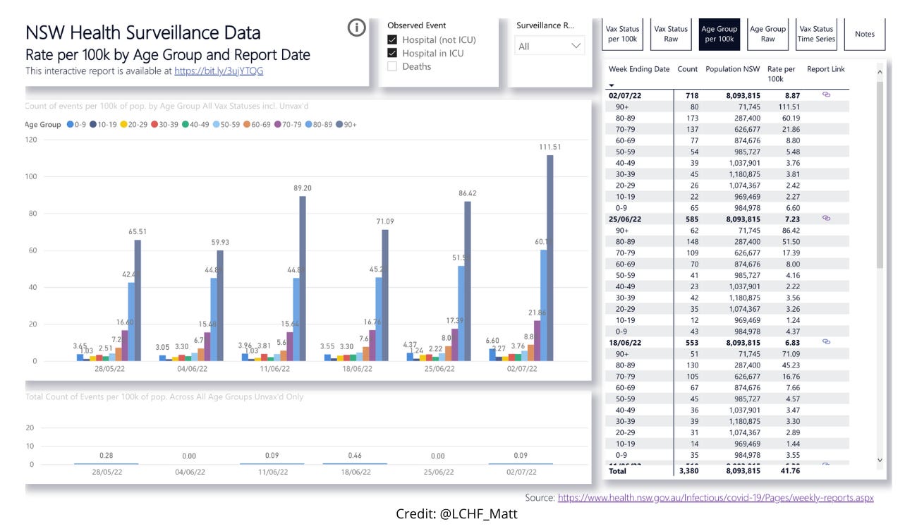 On its face it sounds like a long shot. Surely not in Australia. The government just wouldn’t do that. But, it seems that maybe they would. Dr Syed tracks some strange and shifty sleights of hand by NSW Health in their data reporting. These tricks include inexplicably conflating the 0 dose and Unknown categories between epidemiological weeks 8-20, thus confusing efforts to track hospitalisations and deaths by vaccination status. The aforementioned helpful reader has an FOIR in progress which will hopefully shed light on the decision making process behind this. In week 21 the reports return to the original format of separating out the 0 dose group from the Unknown group.