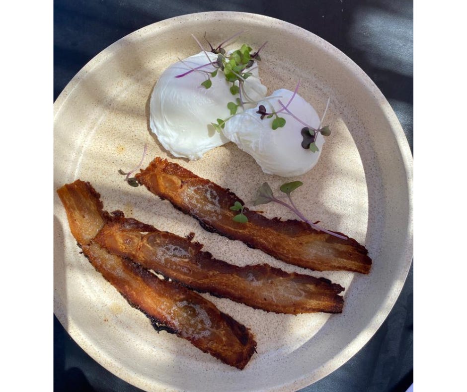 I found an organic cafe near my place and took myself out for bacon and eggs to cheer myself up. Wistfully, I picked off the microgreens before eating.