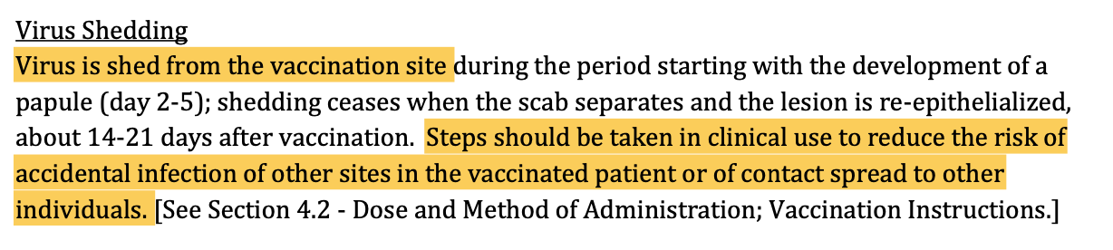 As I understand it, the reason that unvaccinated people are at risk of side effects of ACAM2000 is that the vaccine uses live-attenuated virus, which means that vaccinees shed for a period of time after vaccination (sources generally agree on a window of up to 3 weeks after vaccination, or until scabbing at the injection site has healed). I could be wrong on my understanding of the causal mechanism for ACAM2000 side effects to unvaccinated contacts. If anyone reading this is qualified to speak in more detail on the shedding of live-attenuated virus from vaccinees to unvaccinated contacts and the associated risks, please add to the comments below. Nevertheless, we can say with certainty that ACAM2000 results in shedding of the MPX virus from the site of vaccination, because the product sheet tells us on page 17 that this is so: