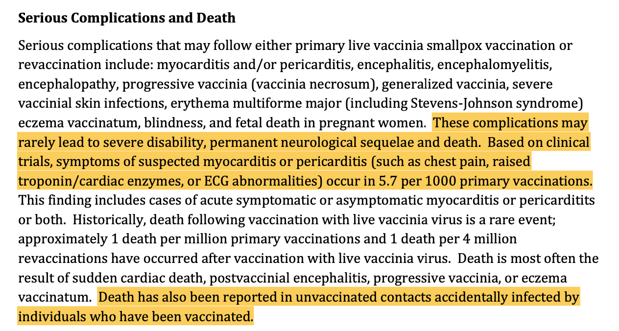 Only the ACAM2000 info sheet directly references the potential for death and other severe side effects to unvaccinated contacts. The JYNNEOS vaccine also contains live-attenuated virus, but I couldn’t find any specific mention of potential harms to unvaccinated contacts within any of the product information sheets via TGA or FDA websites.