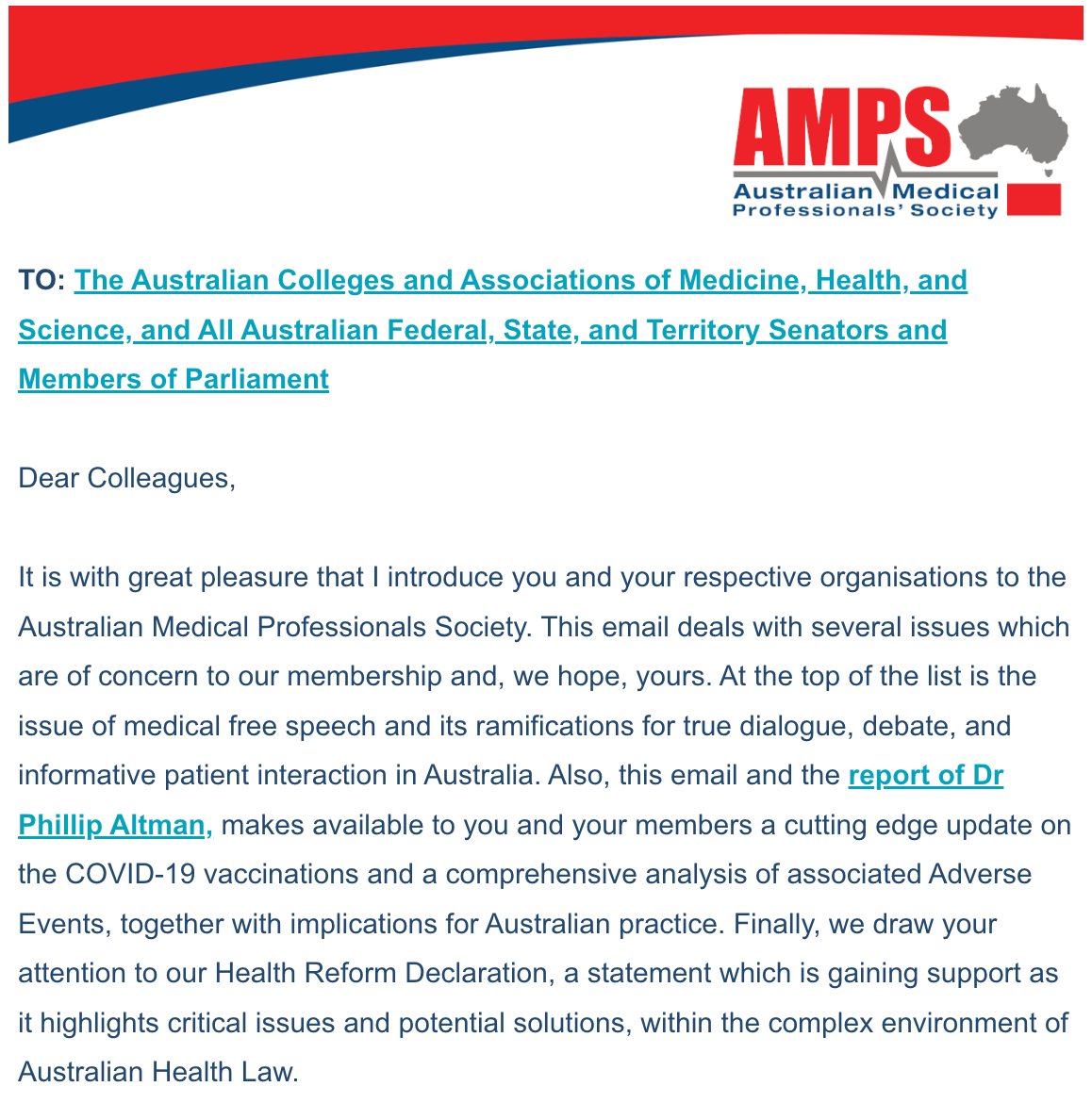 If you have a 10 min coffee break today, I encourage you to read this open letter from the Australian Medical Professionals Society (AMPS). The letter addressed to Australian health bodies, senators and members of parliament, covers key issues including medical free speech, analysis of the Covid vaccination program, and a proposed Health Reform Declaration.