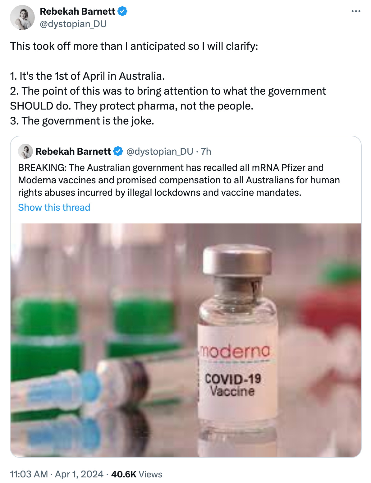 It doesn’t matter who posts whatever it is you’re reading. READ IT PROPERLY BEFORE YOU REPOST IT. If any of the people who shared this post as ‘news’ had clicked through to read the post in full, the first thing they would have seen was an April Fool’s disclaimer immediately underneath. If they’d have clicked through to my profile, they’d have seen multiple posts explaining the date, what was intended with the post, and the Community Notes. If they’d have looked for the supporting news item, they’d have very soon found there wasn’t one. I don’t care who posts the thing you want to share. Never believe anything you read without verifying it. The ‘fact checkers’ rely on you not clicking through to sources much of the time. Mainstream media sometimes make claims without having even read the source, let alone linking it (such as here and here). And of course, anything goes on social media. A post declaring the vaccines banned in Japan last week is case in point. A quick google revealed that it was a misreporting of the actual story - Covid vaccines are no longer tax payer funded in Japan.
