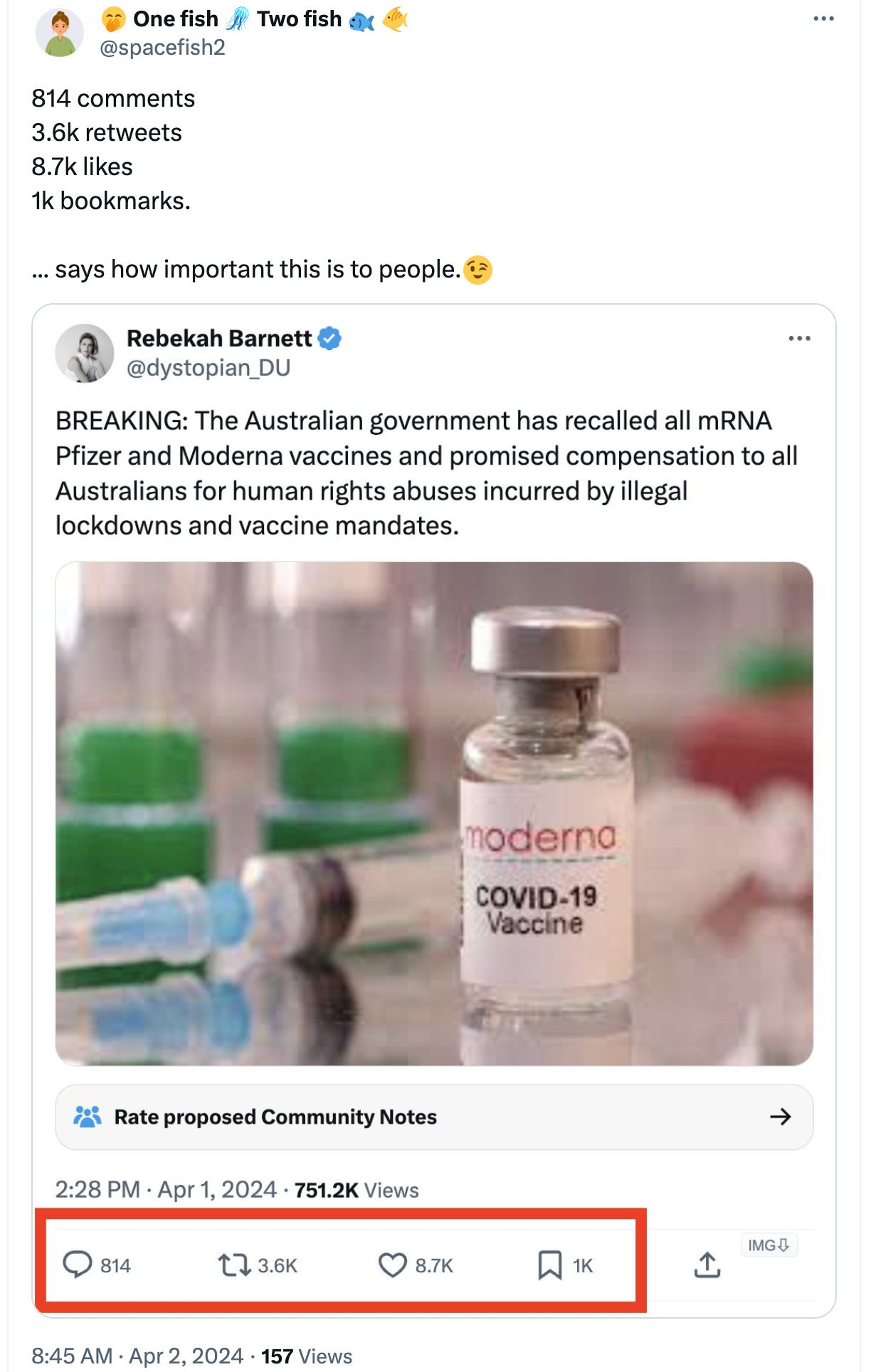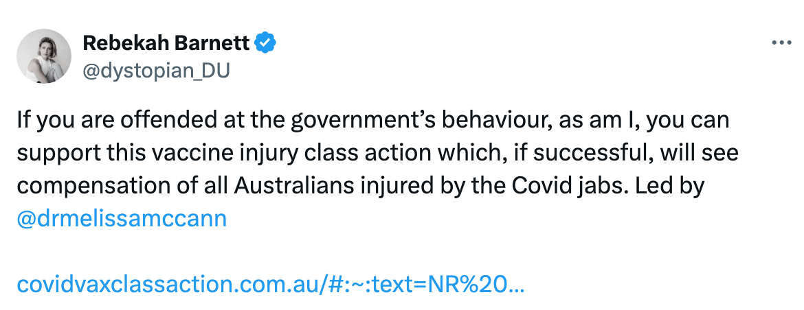 Most people got the point and commented about how good it would be to have a government that put people before pharma and profits. I agreed, and linked to a Covid Vaccine Injury Class Action where people can donate to force the issue with the government (not that anyone should have to do this, but here we are in reality, where the government is captured and only a relative few are prepared to do anything about it, and those relative few need financial support to pull it off).