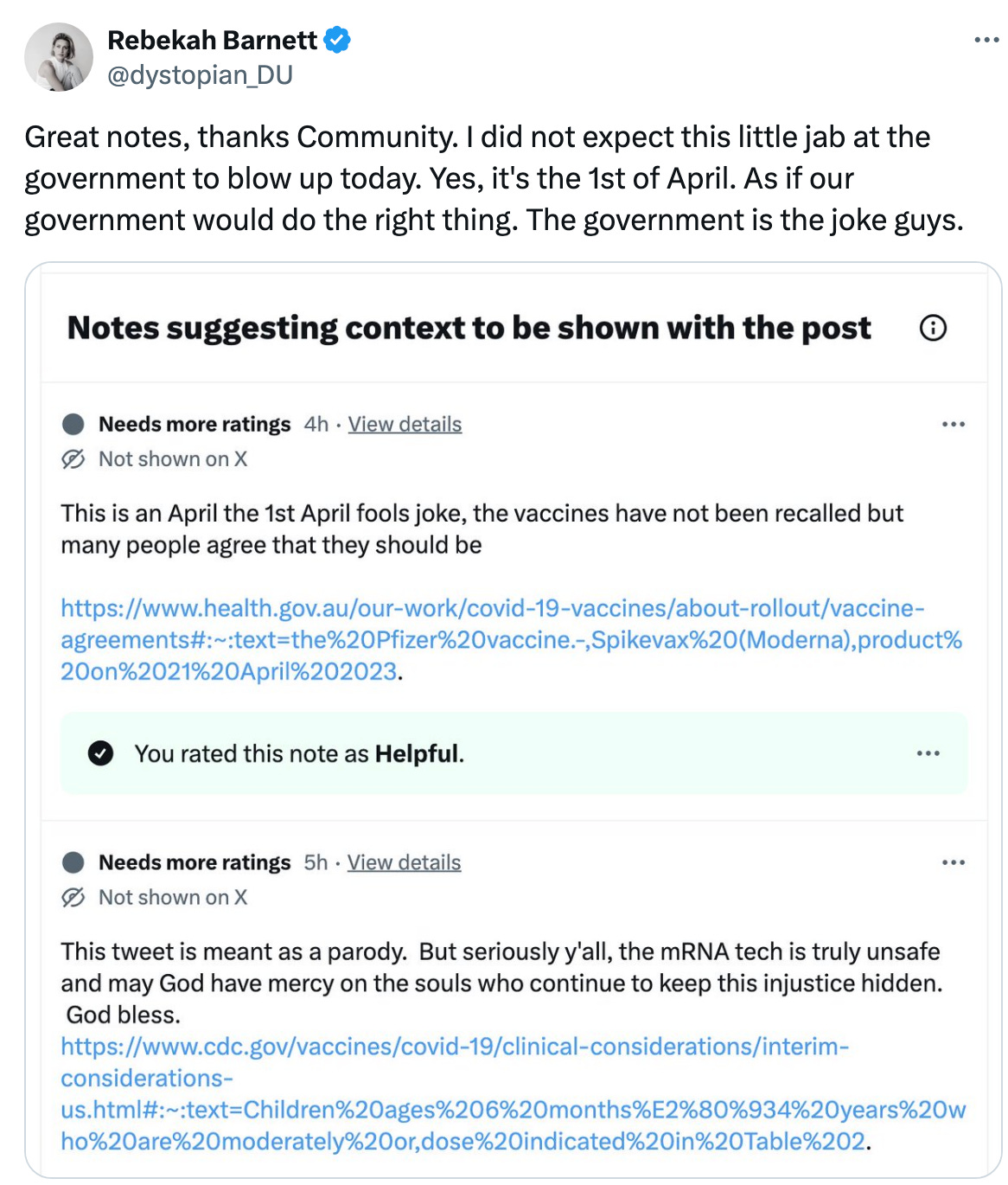 But I wondered - should I delete my April Fool’s post for the few that didn’t catch the gag? By now so many people had seen the original that I decided against deleting it, thinking that it would be better to leave it up with all the April Fool’s disclaimers in the comments and in my timeline. Some savvy users added Community Notes, which I rated ‘helpful’ and reposted.