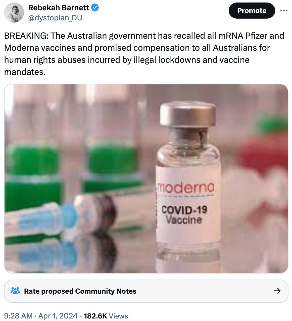 BREAKING: The Australian government has recalled all mRNA Pfizer and Moderna vaccines and promised compensation to all Australians for human rights abuses incurred by illegal lockdowns and vaccine mandates.