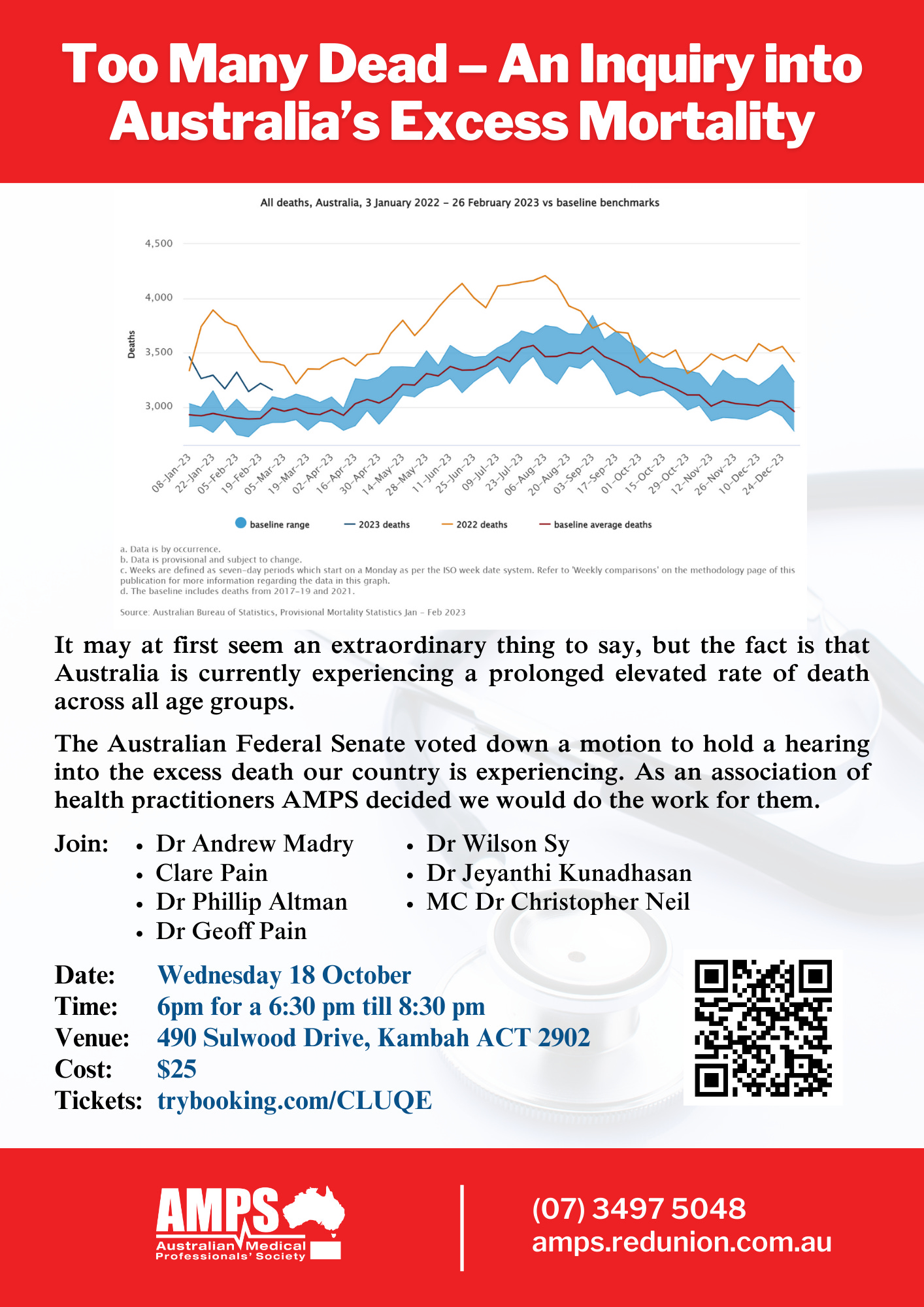 “Conclusions from AMPS are documented in a book due for release titled, Too Many Dead – An Inquiry into Australia’s Excess Mortality. In collaboration with our international colleagues we are calling for an immediate suspension of the vaccination rollout, pending a full and transparent investigation.