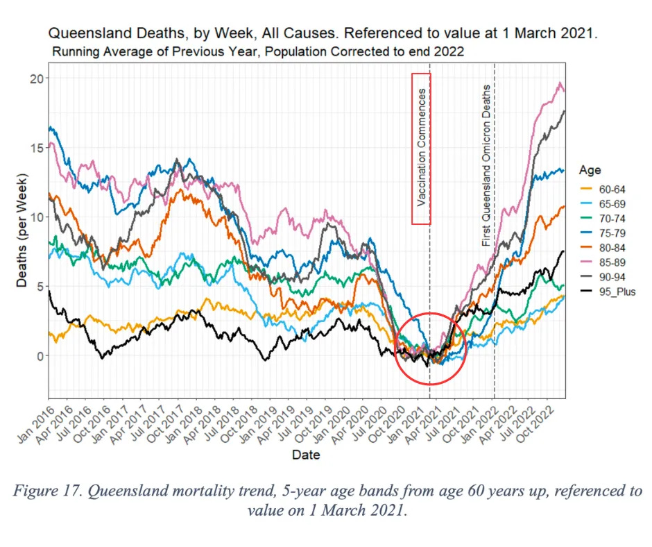 And despite the only Australian study of all-cause mortality trends conducted on a pre-Covid but post-vaccinated population showing that death rates started trending upwards with the vax rollout, not Covid.