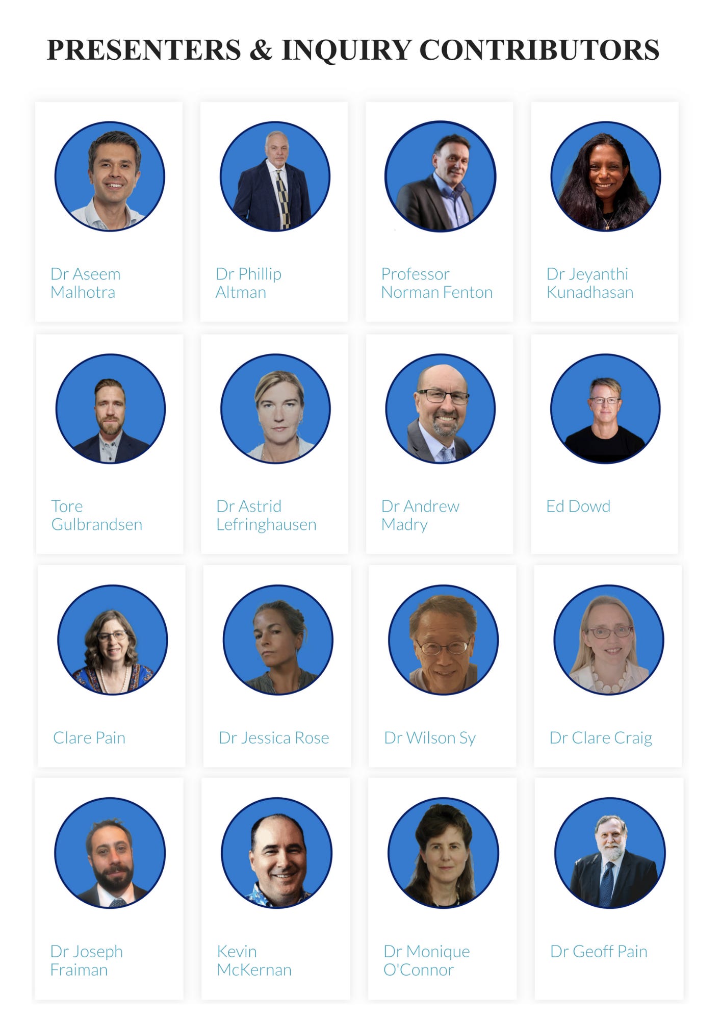 The list of presenters and contributors includes many esteemed names at the forefront of medicine, science, statistics, data analysis, and industry. The presentations will be filmed, available for viewing at a later date, and will be accompanied by a book ‘Too Many Dead’, to be released after the event.