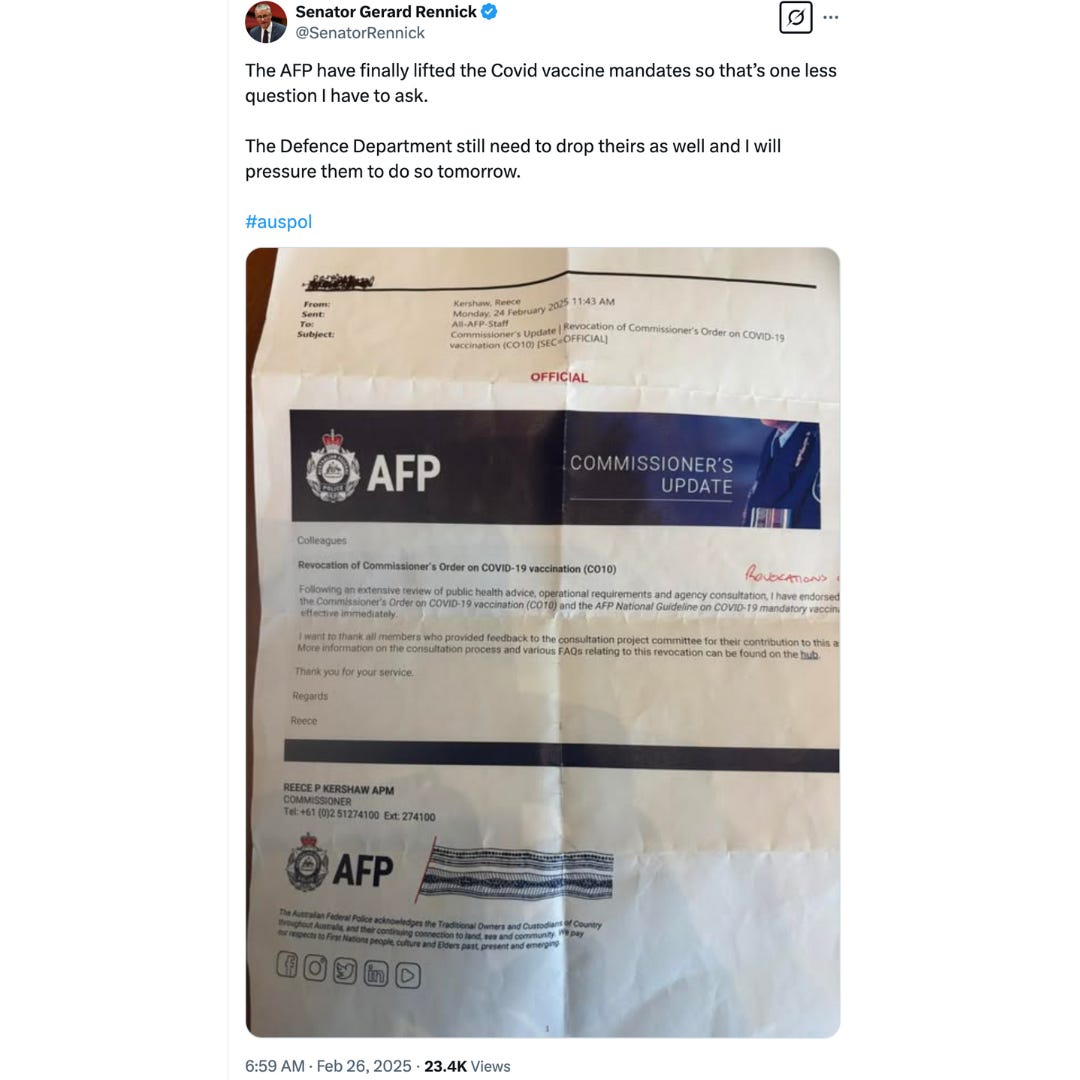 Three years after it became universally acknowledged that Covid vaccines provide negligible protection against infection and transmission, the Australian Federal Police (AFP) has finally dropped its Covid vaccine mandate.