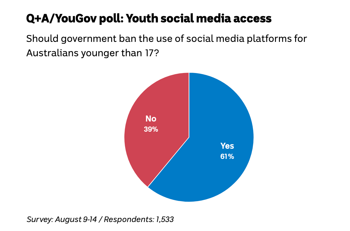 Recent polling shows strong public support for an age-based social media ban, with 61% of respondents agreeing that the government should restrict the use of social media platforms for Australians younger than 17. Unsurprisingly, support was lower among younger Australians. Only 54% of respondents aged 18 to 24 agreed with the ban.