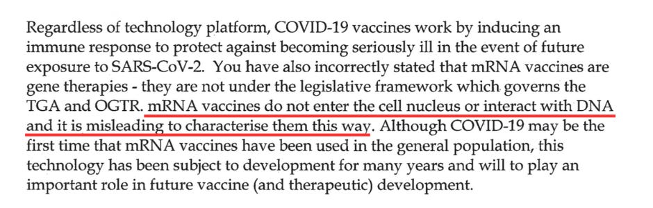 “You have… incorrectly stated that mRNA vaccines are gene therapies - they are not under the legislative framework which governs the TGA and OGTR. mRNA vaccines do not enter the cell nucleus or interact with DNA and it is misleading to characterise them in this way.”