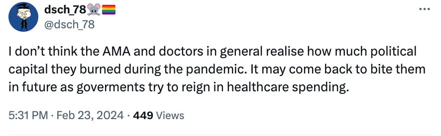 Yet the AMA has shown themselves to be woefully out of touch with public sentiment, burning through whatever remaining political capital it still has after years of wilfully blind adherence to the ‘safe and effective’ dogma.