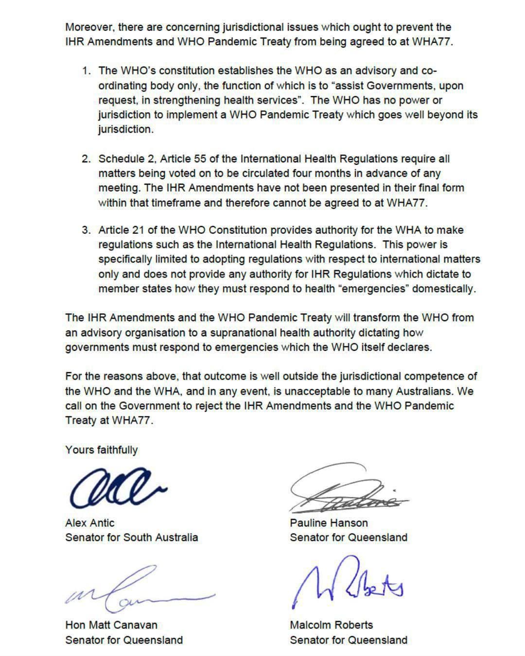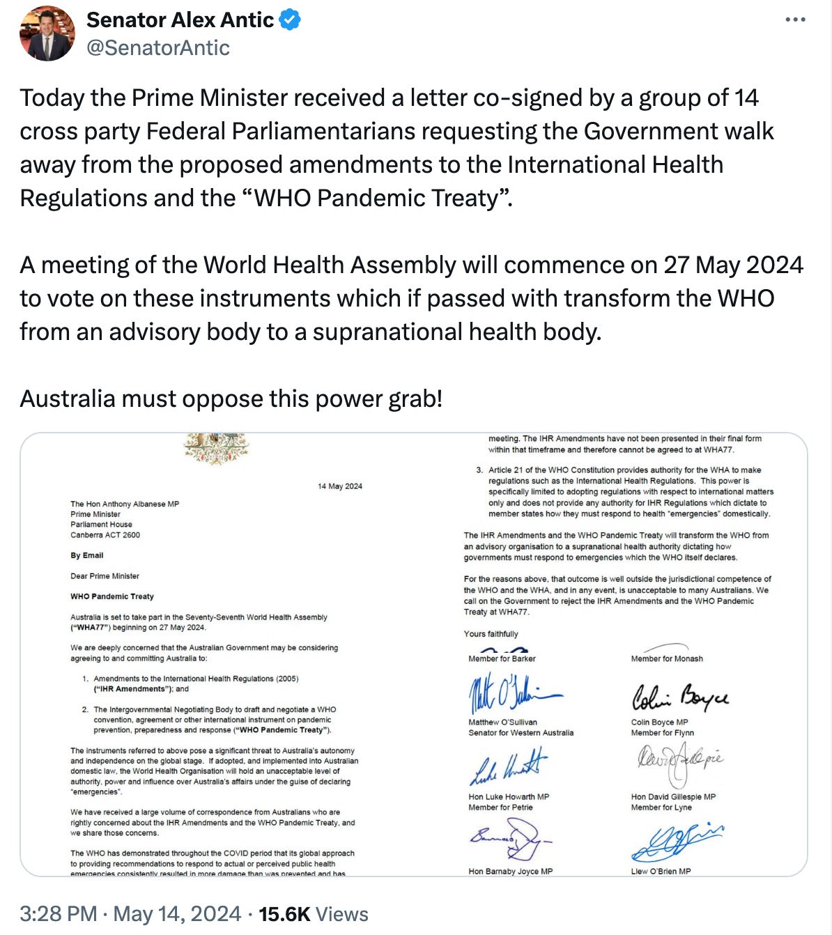 “We call on the Government to reject the IHR Amendments and the WHO Pandemic Treaty at [the 77th World Health Assembly],” concludes the letter, signed by the below members of the Coalition and the crossbench. At the top of the list is vocal WHO critic Senator Alex Antic, who has frequently referred to the WHO reforms as a “power grab.”