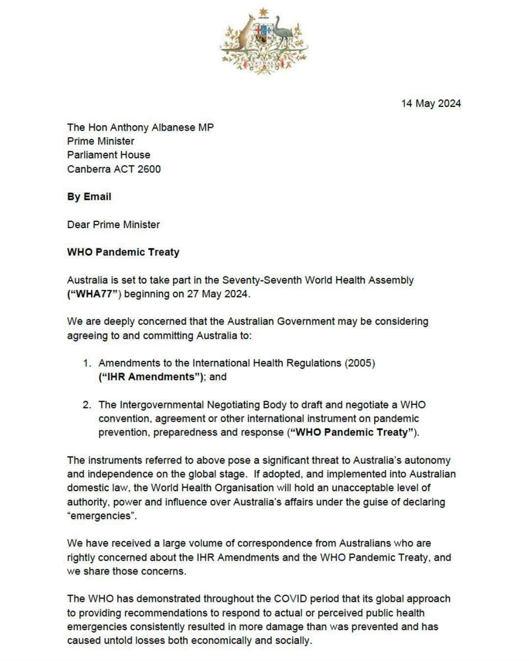Fourteen Australian Senators and MPs have written to Prime Minister Anthony Albanese urging his Government to reject impending WHO pandemic reforms, which are to be voted on by WHO Member States at the 77th World Health Assembly (WHA) at the end of this month.