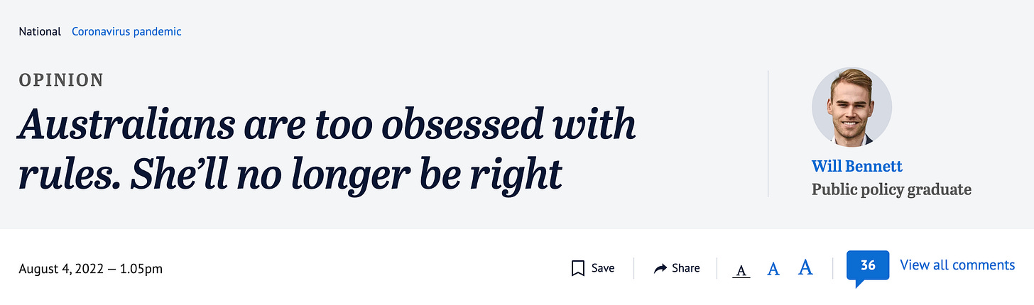 “Truth is, Australians are sticklers for rules. They enjoy being governed, enjoy telling others what to do, and attack those who dare deviate from the accepted norm.”