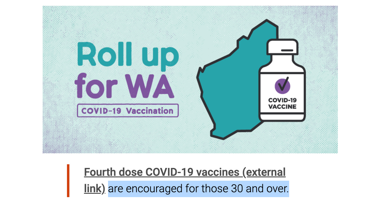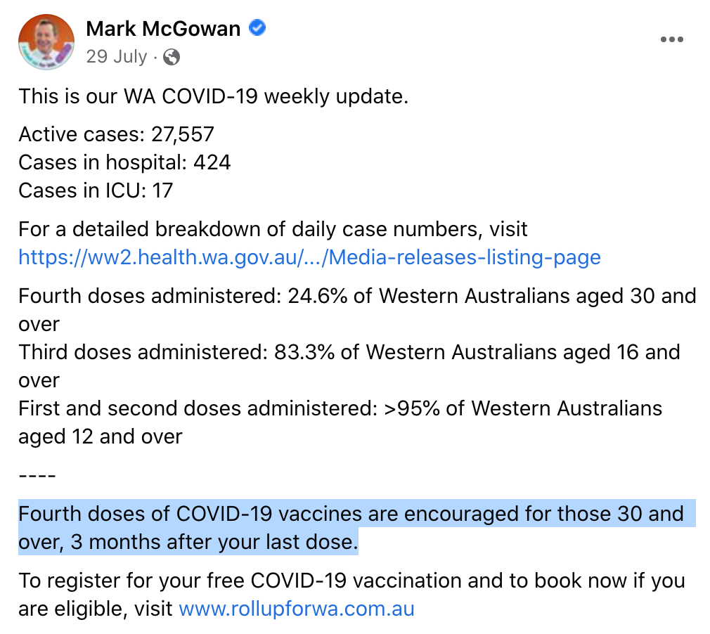 Here is WA Premier Mark McGowan encouraging everyone over the age of 30 to receive a fourth shot on his Facebook page. He is not a medical professional either.
