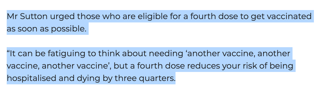 Here is Victorian Chief Health Officer Brett Sutton telling everyone who is eligible (30+ years) to get their fourth dose “as soon as possible.” Sutton actually does have a medical degree, so he should know better.