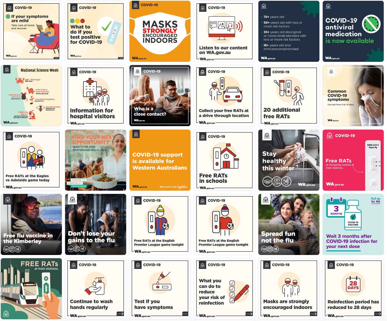 Rather than go on and on listing all the times that Australian health and government professionals have overreached the advice of our national immunisation advisory body (we’ll be here all day), I’ll finish this section with an image to give readers a sense of the constant flow of vaccination and Covid-related propaganda that Australians are subjected to on a daily basis. Below is a snapshot of all photo posts on the WA Government Facebook page from 18 July - 23 August 2022. 27/30 photos are related to Covid or the flu.