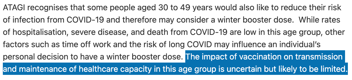 Sutton’s statement is especially surprising given that ATAGI specifically states that the benefits in the eligible group of 30-49 years old are uncertain and likely, if anything, to be limited.