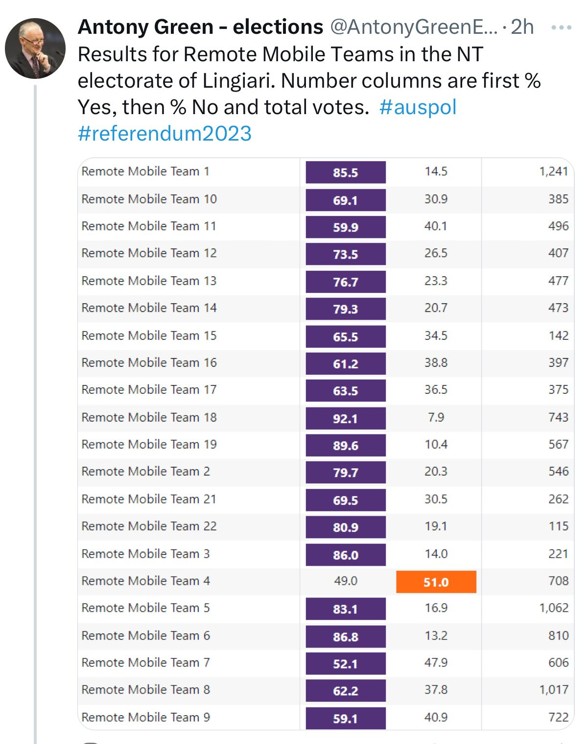 For example, in the Northern Territory electorate of Lingiari, where 40 per cent of the population is Indigenous, 21 of 22 remote mobile polling booths turned in a Yes majority, while the wider electorate voted 56 per cent for No. Totalling all booths, the votes collected by remote mobile teams in Lingiari went 69.3 per cent to Yes, 30.7 per cent to No.