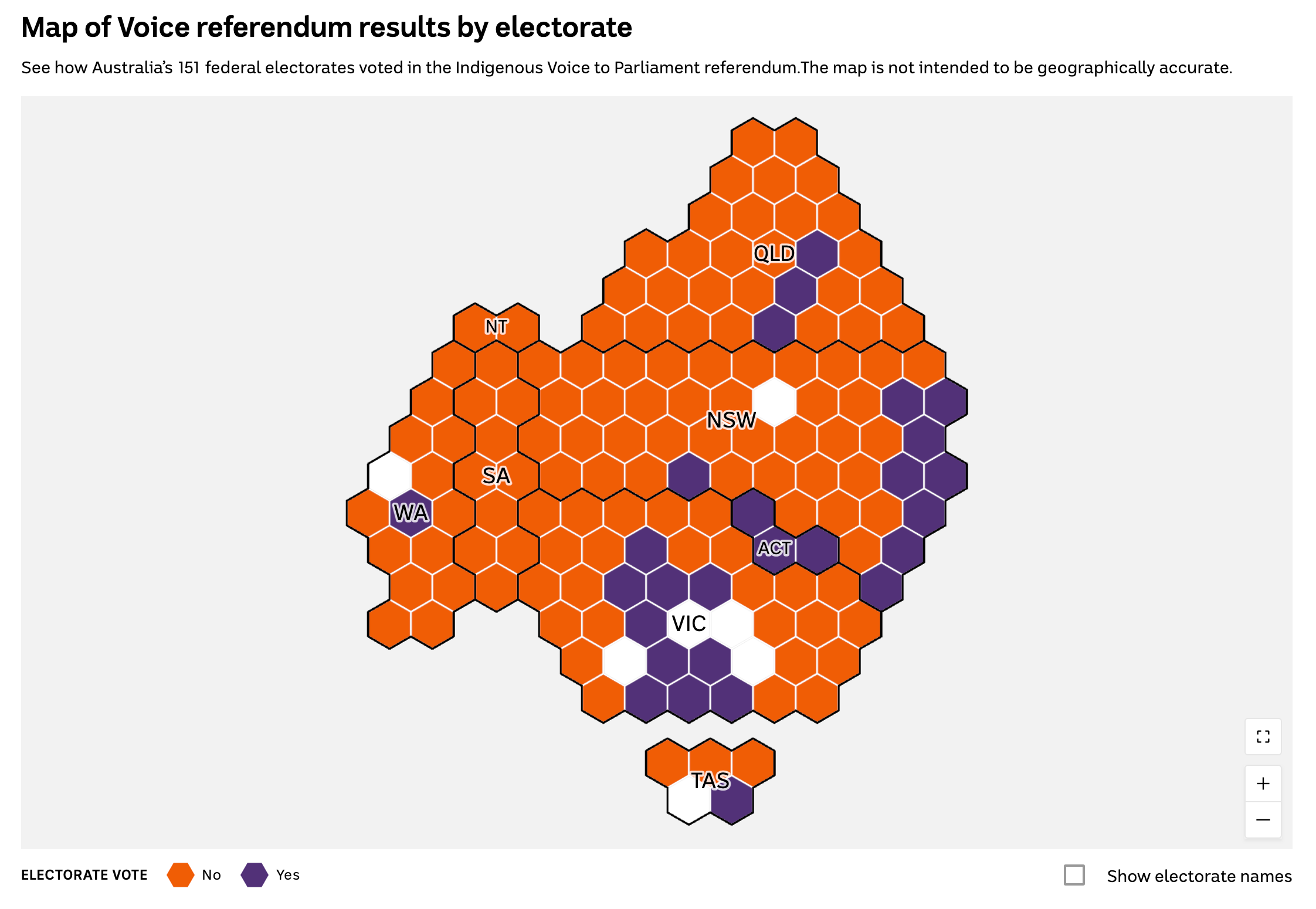 However, the same report acknowledges that in other areas with a high proportion of Indigenous voters, votes for Yes came in under majority. In Parkes, in the small community of Boomi, just three of the 74 votes cast were Yes for the Voice.