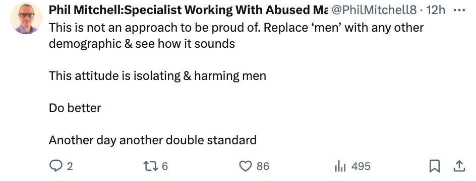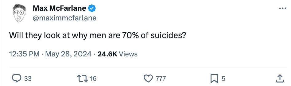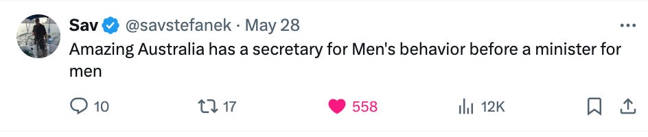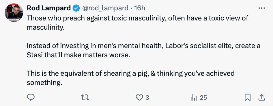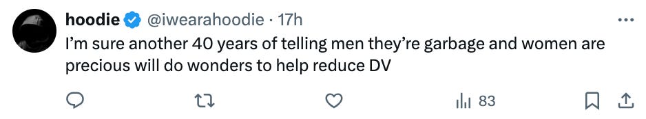 The film conveys one of the core sentiments expressed in the social media comments under the Parliamentary Secretary for Men's Behaviour Change announcements - that male behaviour in general is being cancelled, and that masculinity is treated as inherently toxic. This may not be the Victorian Government’s view or intention, but it’s what many commenters believe it to be.