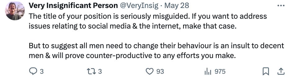 Similarly, the political imperative to ‘do something’ has yielded two dimensional talking points about controlling access to ‘misogynistic material’ online, to hectoring men for being so awful, to issuing rallying statements like "men have to stop killing women.”