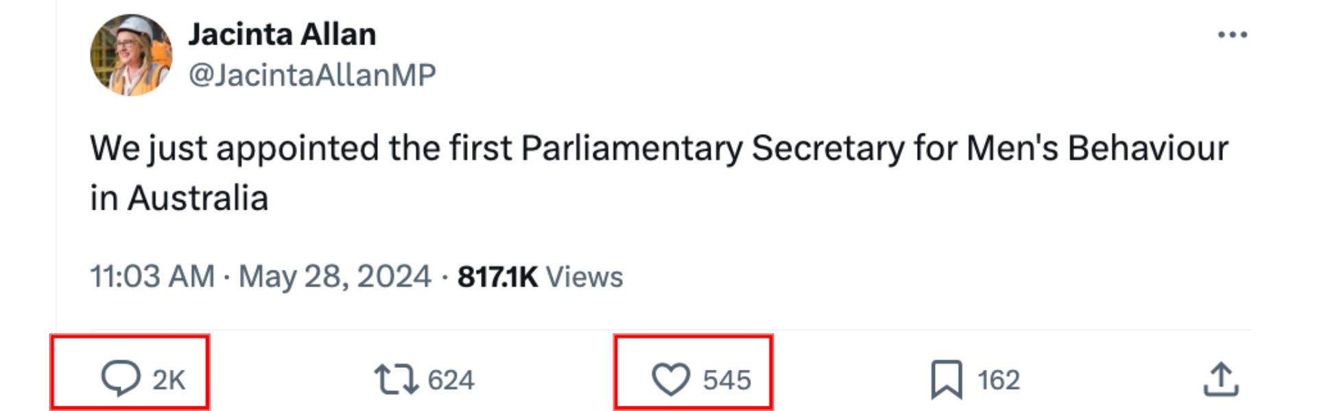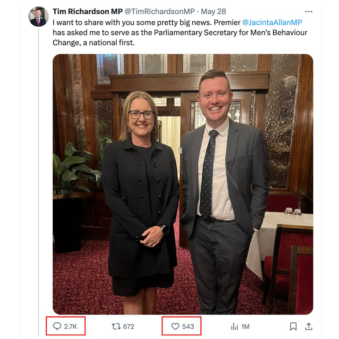 The announcements from Richardson and Premier Allan were ‘ratioed’ on social media. A ‘ratio’ is urban slang to describe the way dislike of a post is expressed on social media sites that don’t have a dislike button. Instead of liking the post, people who don’t like it will comment on it. A high ratio of comments to likes indicates that the reaction to a post is predominantly negative.