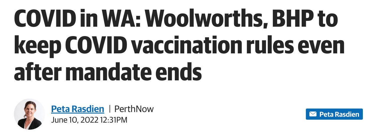 Woolworths insists all staff be vaccinated against Covid, which may reduce their chances of dying but will not affect rates of infection and transmission between staff or from staff to customer. They do not require that staff take other life-saving measures as condition of employment, such as maintaining healthy BMI, eating a quota of organic vegetables, or refraining from chemical carbonated sodas.
