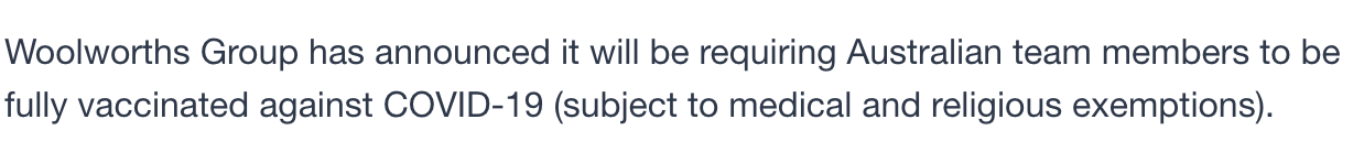 I have not stepped foot inside a Woolworths supermarket since they enforced this ludicrous mandate. Their 'vaccination' policy made no sense right from the get-go and it makes even less sense now. Australia's most trusted brand? What a travesty.