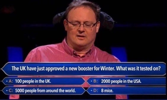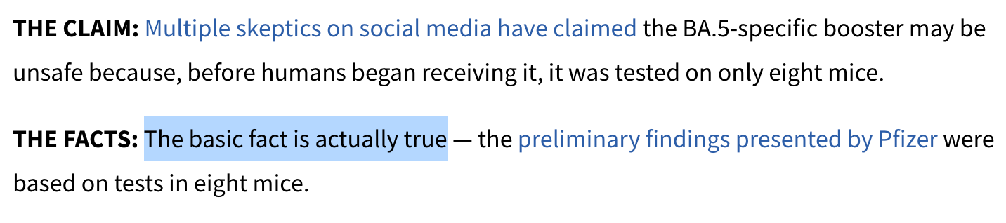 I posted this on Monday with the caption ‘Meme Monday 🐀’. It was taken down in minutes:That the new BA.4/5 bivalent booster was approved based on pre-clinical testing on 8 mice is an uncontestable FACT (as opposed to opinion or fallacy). Here is CBS ‘Fact Checker’ confirming this FACT: