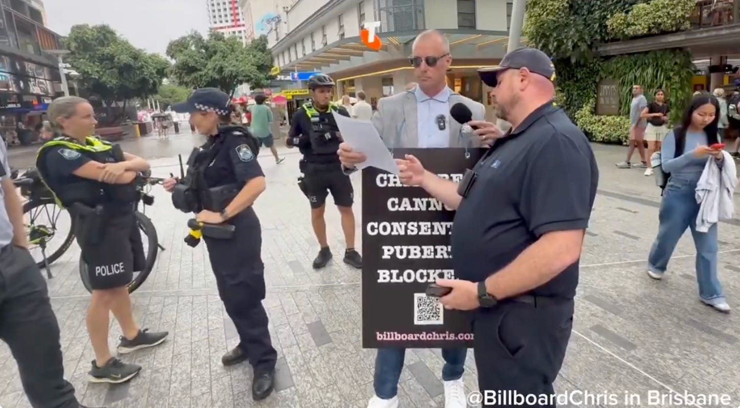 Since arriving in Australia last week, Elston has stirred up controversy wherever he goes. In Brisbane, Elston was forcibly removed by police officers for standing in the public open-air mall while wearing a billboard saying “Children cannot consent to puberty blockers,” and was fined $806 for “obstructing and unreasonably disturbing a person in the mall,” despite Elston not having approached anyone.