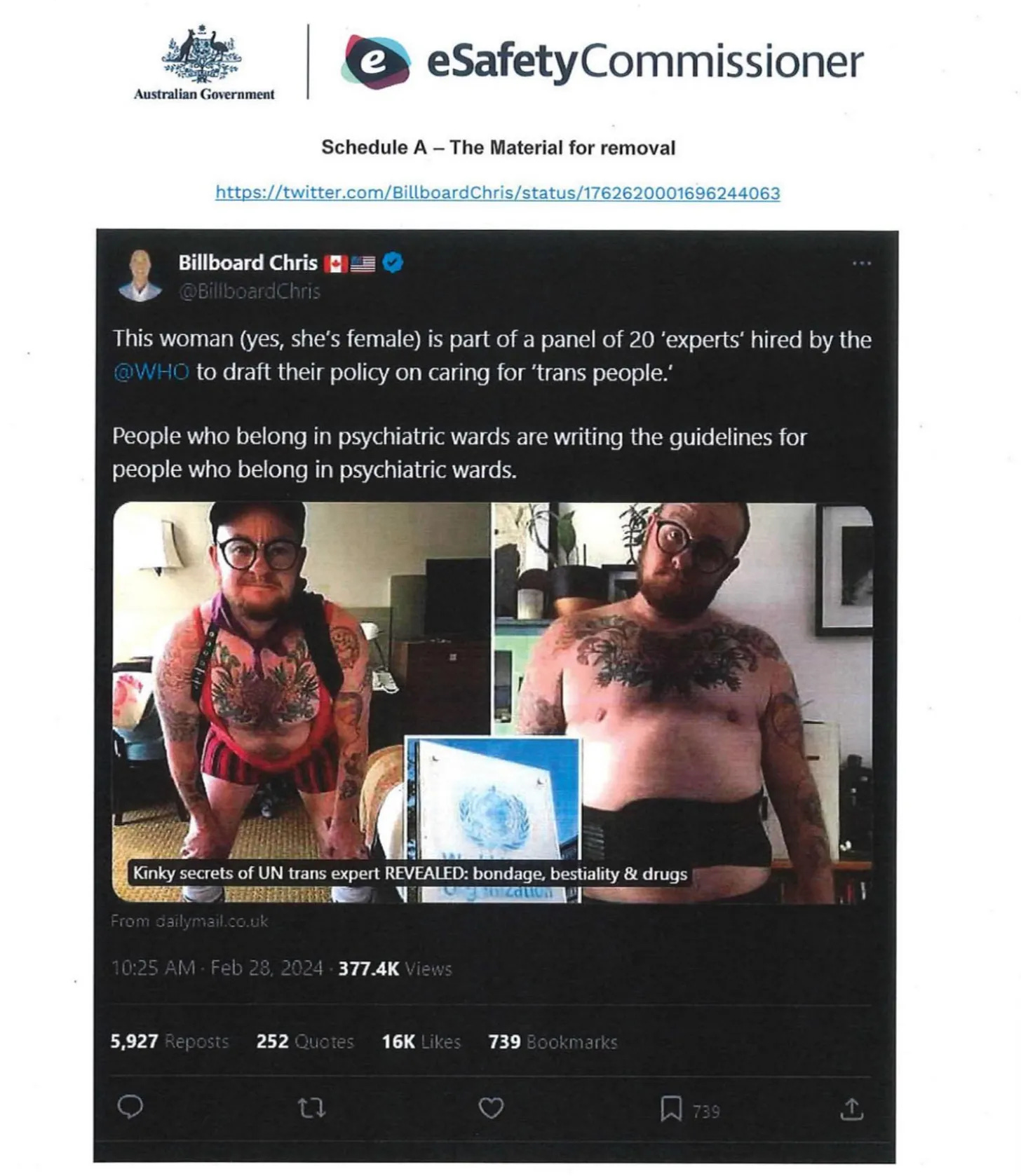 First it took down tweets on breastfeeding. Now, Australia’s online safety regulator, the eSafety Commissioner, has threatened social media platform X (formerly Twitter) with a hefty fine over a post characterising the trans male identification of a bearded natal female as a psychiatric condition.