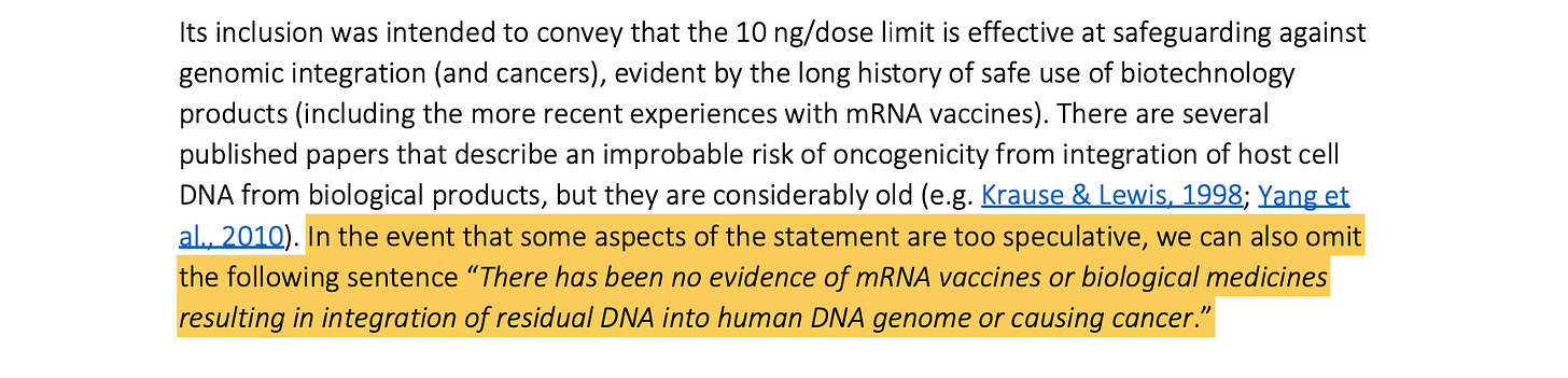 “In the event that some aspects of the statement are too speculative, we can also omit the following sentence “There has been no evidence of mRNA vaccines or biological medicines resulting in integration of residual DNA into human DNA genome or causing cancer.””