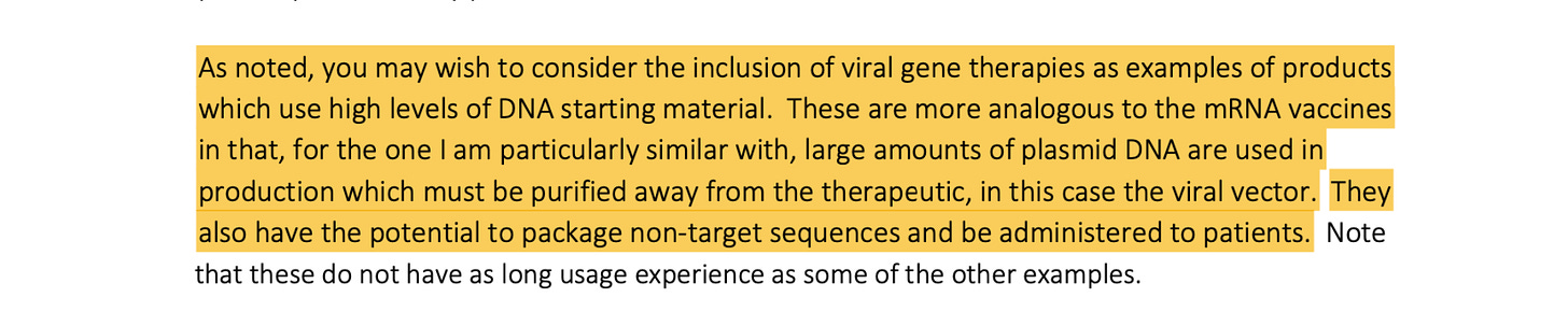 Likening the modRNA vaccines to “viral gene therapies” due to their use of high levels of DNA starting material, this person notes that, “They also have the potential to package non-target sequences and be administered to patients.”