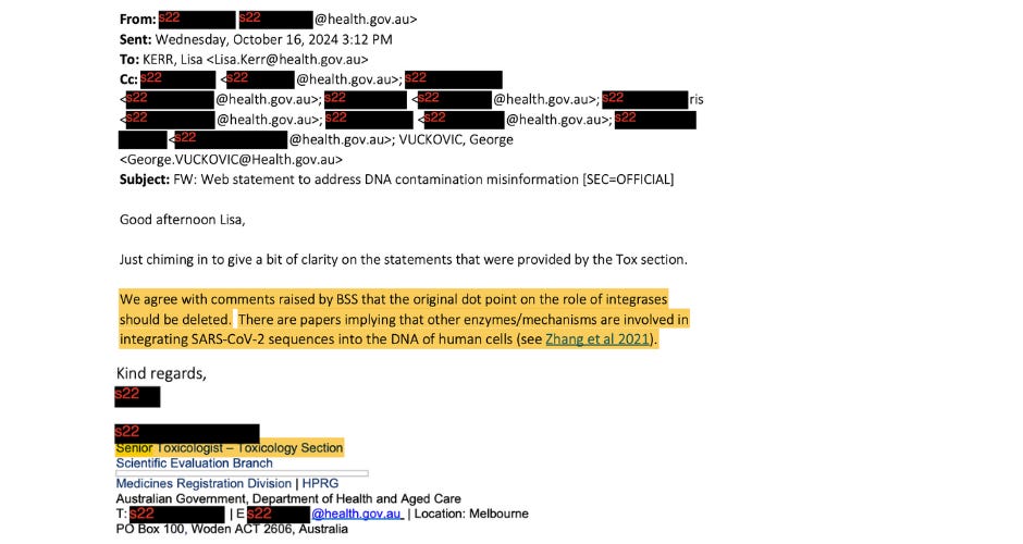Australian drug regulator knows DNA fragments in mRNA vaccines can enter nucleus and integrate into genome, internal emails show