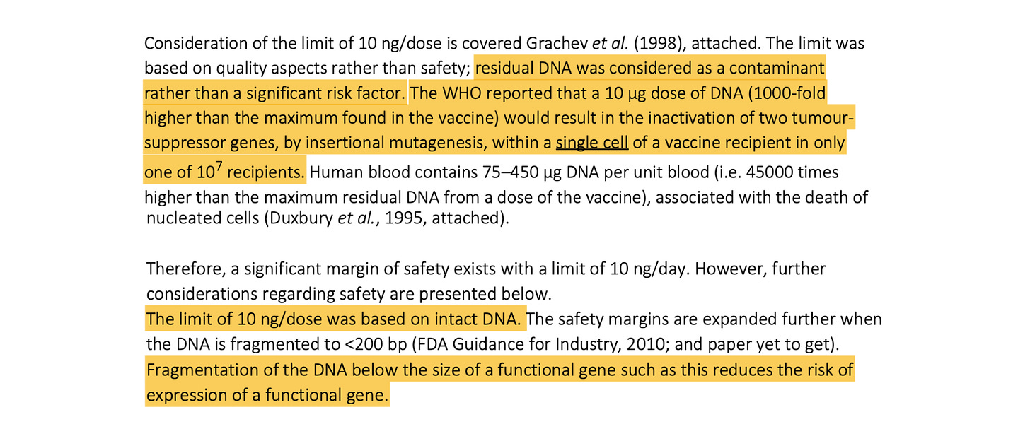 “Is it even biologically possible for residual DNA at a limit of no more than 10 ng/dose to retain enough integrity from dosing to entering a cell and being enough to be incorporated into a genome for it to induce the effects that are being speculated about?”