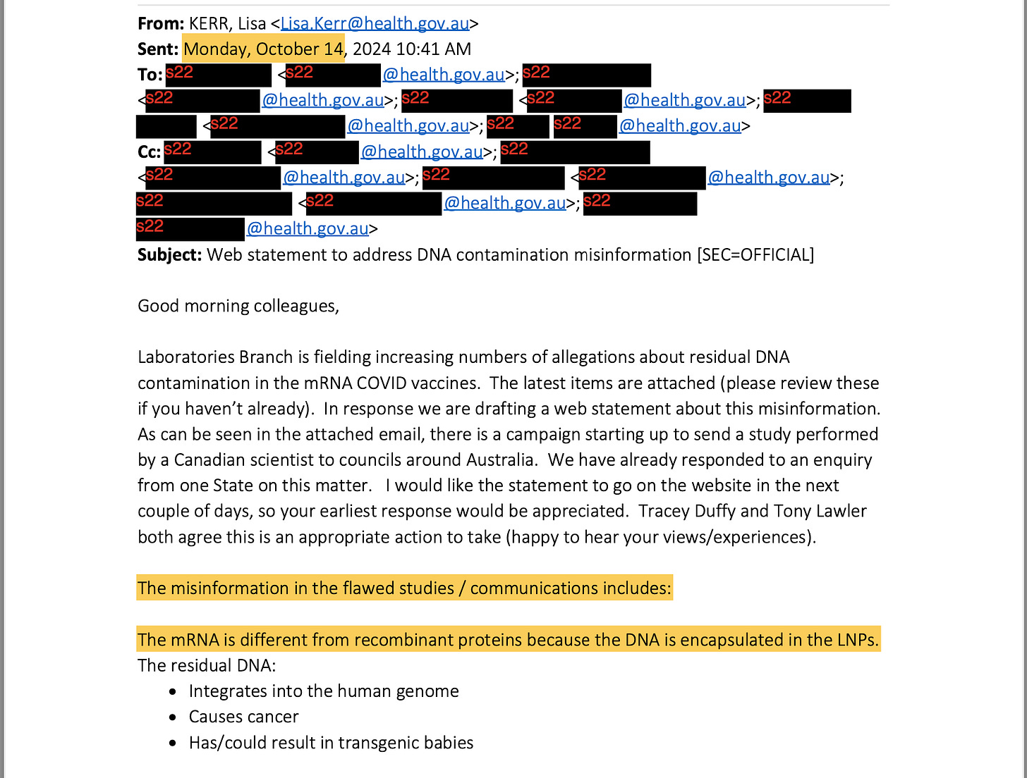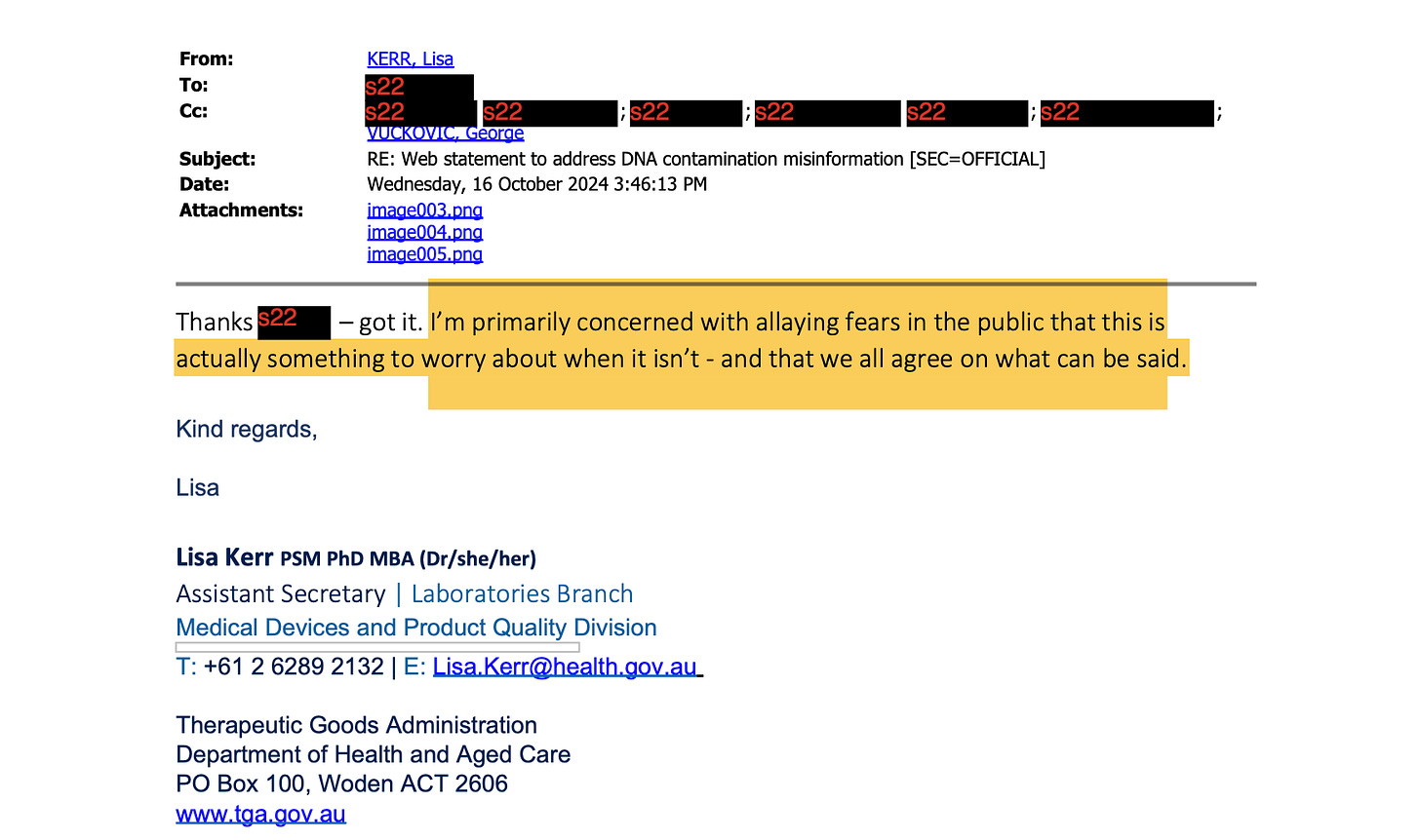 Indeed, Dr Lisa Kerr, Assistant Secretary of the Laboratories Branch, who co-ordinated the internal communications to develop the TGA’s statement on DNA contamination ‘misinformation’ said as much.