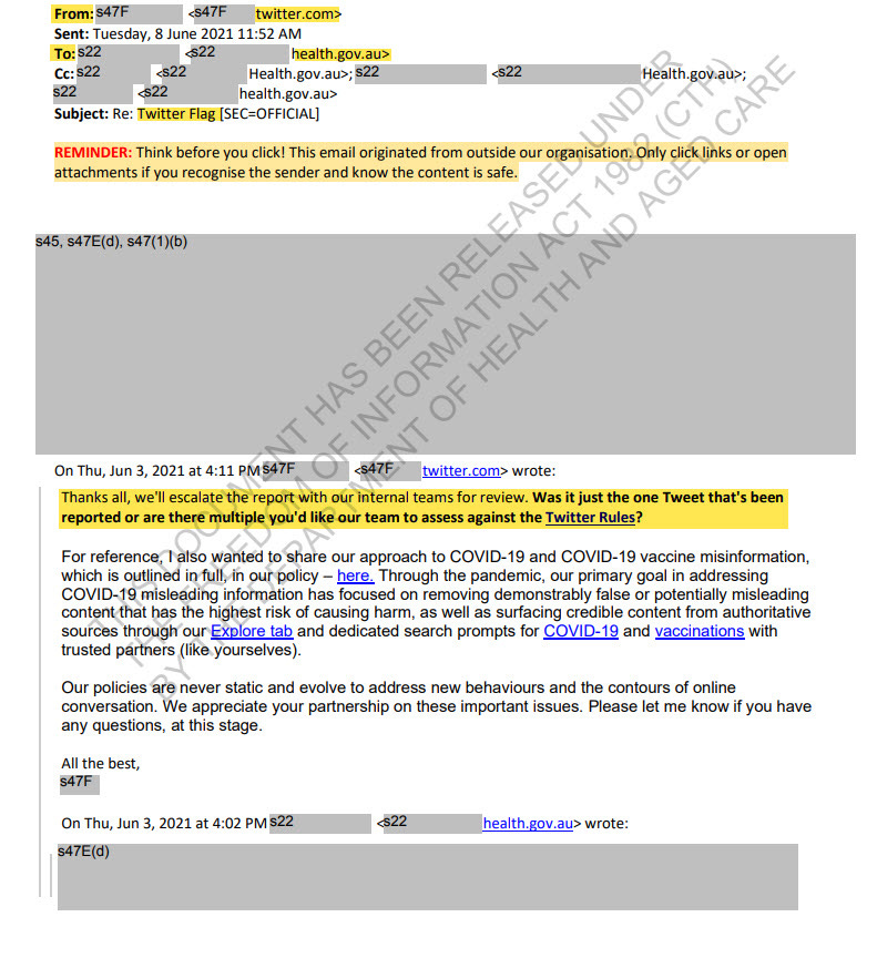 The documents show that the DOH also emailed Twitter and Instagram to flag social media posts, including one that directly quoted the TGA’s Covid vaccine safety report. Twitter emailed back asking the DOH if there were any other Tweets that they would like the Twitter team to assess.