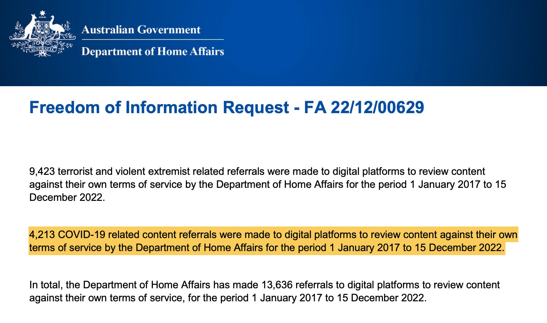 The FOI documents1 show that from the start of the pandemic up to 15 Dec 2022, the Department of Home Affairs (DHA) referred 4,213 social media posts that they believed to be in breach of big tech platforms’ community guidelines. This comes as a surprise, given that the Department’s purview includes border security, counter-terrorism and immigration, but not public health.