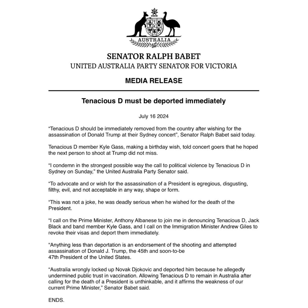 “Tenacious D should be immediately removed from the country after wishing for the assassination of Donald Trump at their Sydney concert,” said Senator Ralph Babet of the United Australia Party in statement, viewed over four million times on X.