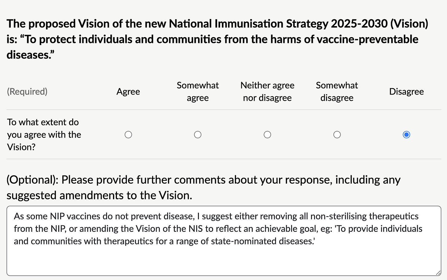 The survey discusses enhancing vaccine safety surveillance. But if the Therapeutic Goods Administration is going to handwave away historically unprecedented levels of injury reports, as it has done during Covid, then this too will be fairly useless. Improvement of vaccine safety surveillance has to be an end-to-end solution - not just collating reports, but following up, analysing and taking action (even if not in the interests of the TGA’s sponsors). I see nothing in the discussion paper to acknowledge this.