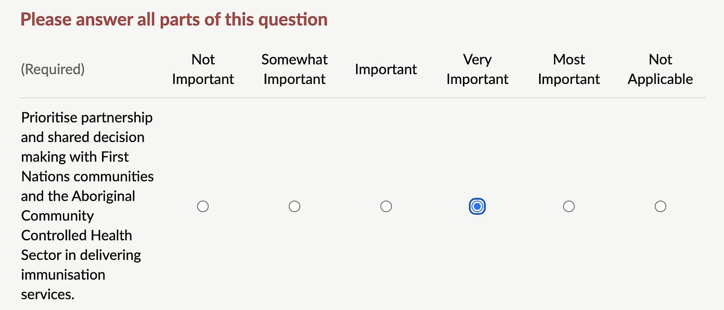 For example, when the survey asks respondents how important it is for the NIS to prioritise partnership and shared decision-making with FNP in delivering immunisation services, do they mean they’ll partner with FNP to tailor immunisation policies to their communities? Or do they mean they’ll partner with FNP to force vaccination rates up against the will of the communities, like they did during Covid?