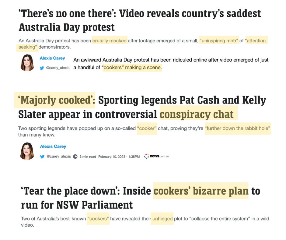 News.com.au is exemplary in the field of ‘cooker watch’ propaganda, turning in regular reports mocking ‘cookers’ for their conspiracy theories. Special mention to senior reporter Alexis Carey, who displays a mastery of the 5-step Delegitimising Dissenting Voices as Cookers System™️ like none other.