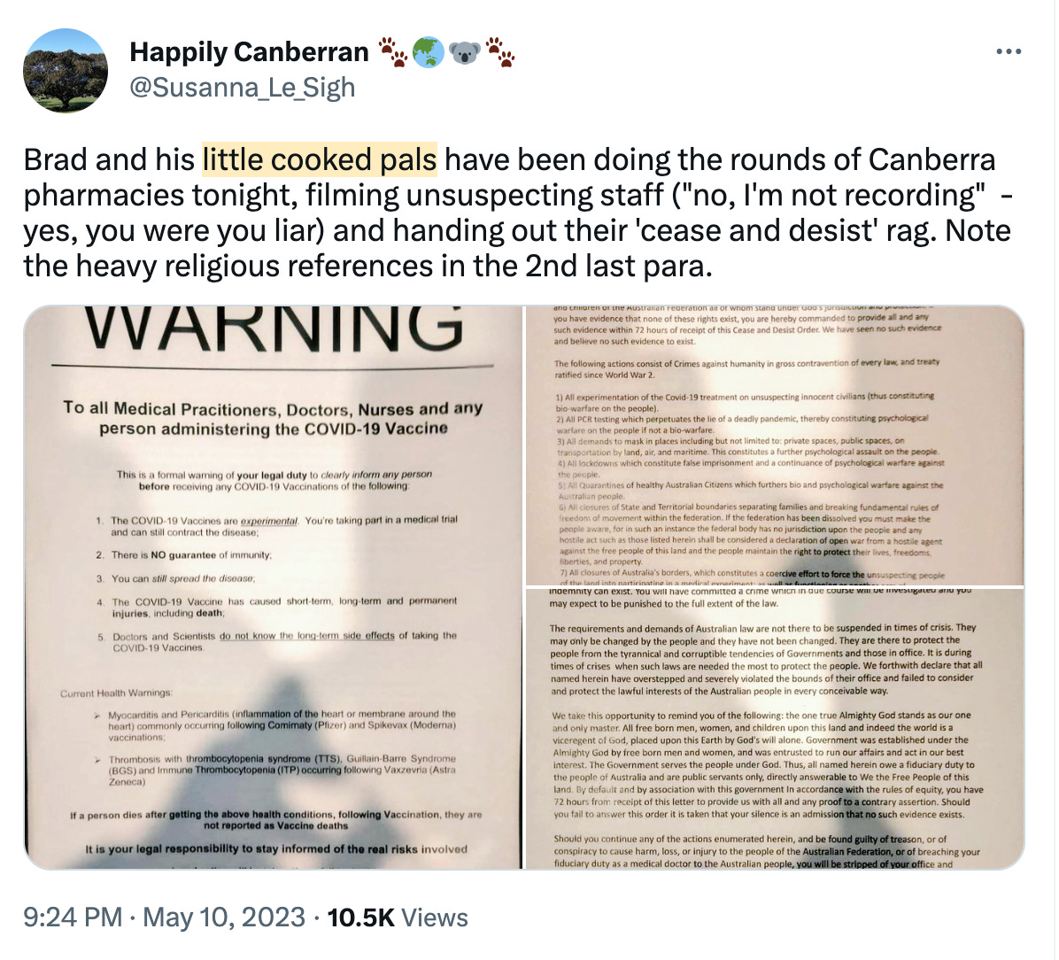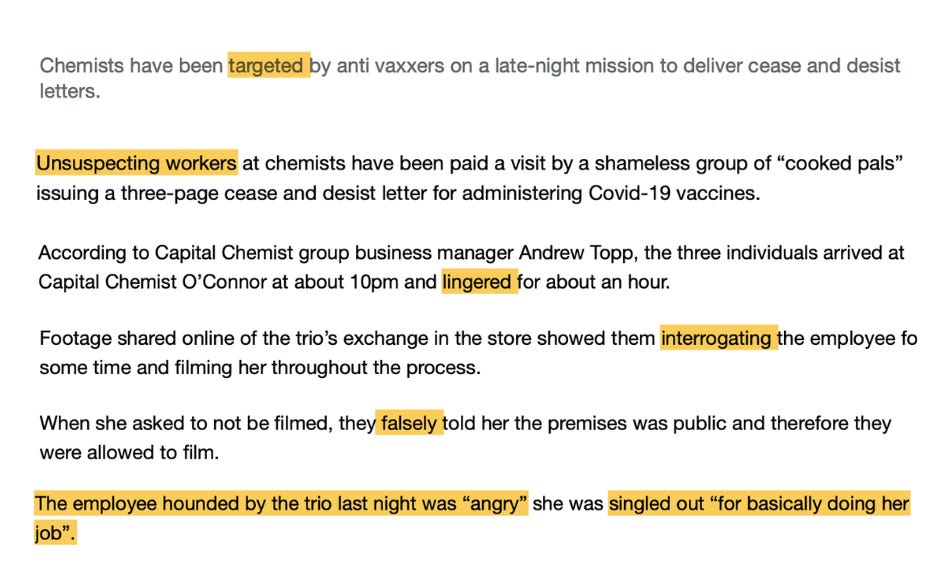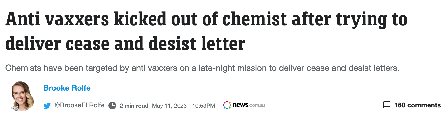 In this case study, three subjects entered a Canberra chemist late at night to ‘serve’ a notice to the staff, warning them that they have a legal duty to provide informed consent and asking them to ‘cease and desist’ from administering the shots. The three really did gift this propaganda opportunity to News.com.au on a platter, as their behaviour was not ok - they were verbally aggressive, they hung around for too long, and they filmed an employee without consent on private property.