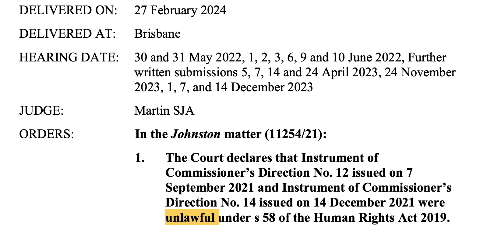 In a decision handed down on Tuesday, Justice Glenn Martin found the Queensland Police Commissioner Katarina Carroll’s direction for mandatory Covid vaccination, issued in December 2021, to be unlawful under the Human Rights Act.