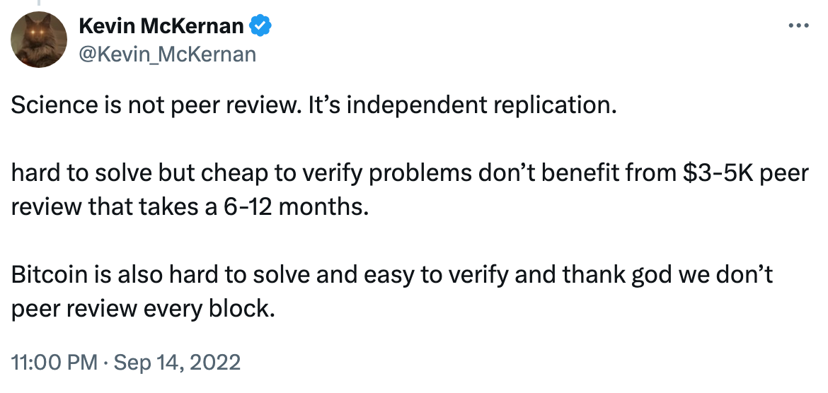 In light of the prospect that most published research findings are false (as famously asserted in a 2005 article by Professor John Ioannidis), McKernan questions the value of peer-review, instead favouring replication or refutation in the real world.