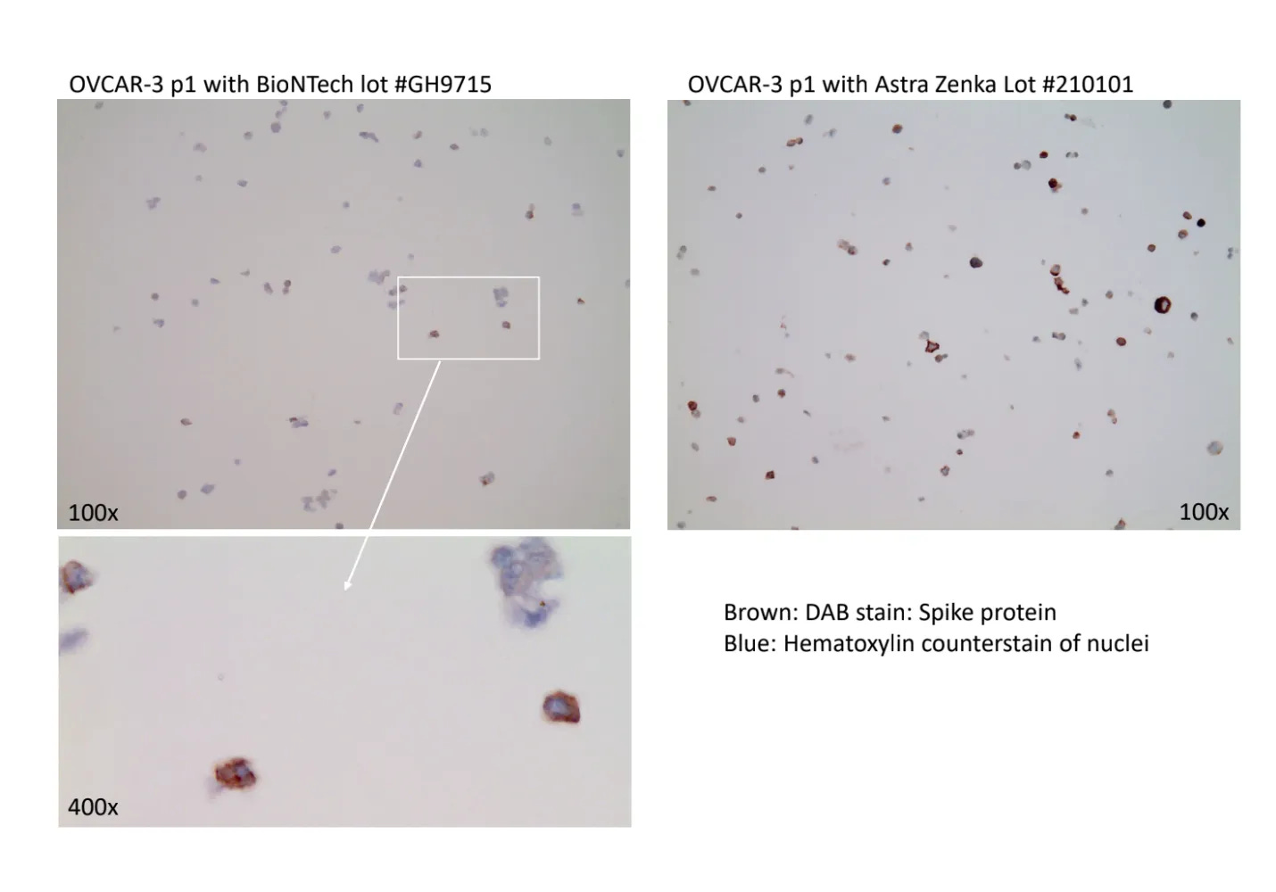 Immunohistochemistry (IHC) was then performed, a staining process that Dr Kämmerer used to detect levels of spike protein expression produced by the vaccine modified-RNA.