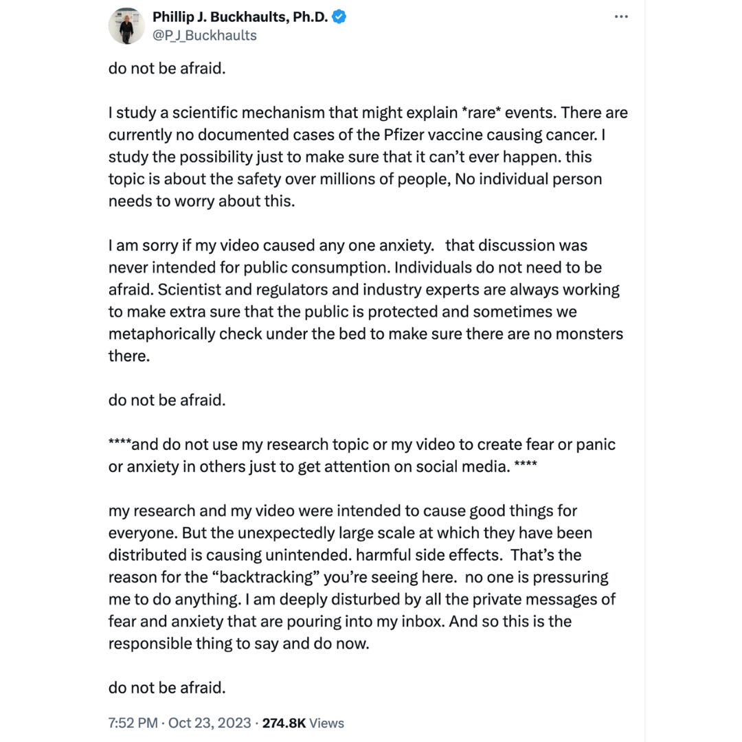 Believing the hearing to have been private, Dr Buckhaults was alarmed that the widespread distribution of his testimony may have caused “unintended, harmful side effects.” He requested that YouTube take down his testimony video, which is now defunct.